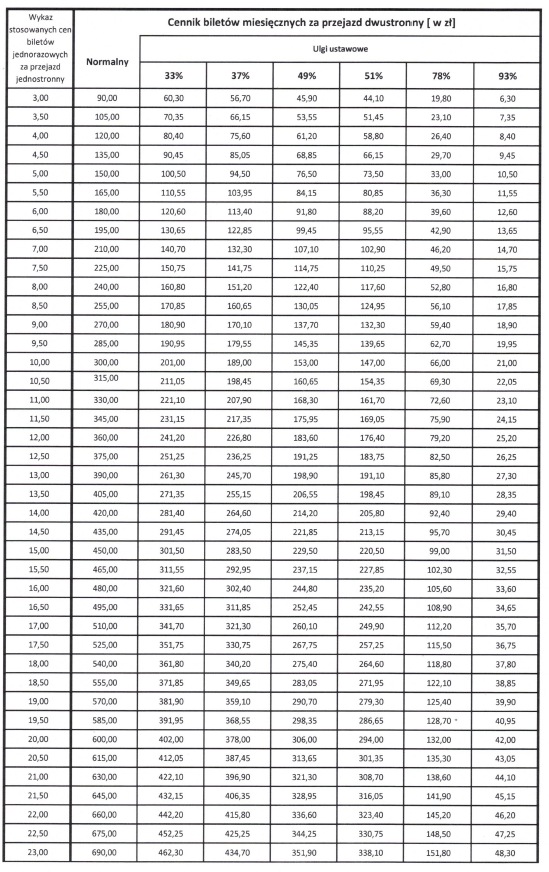 Cennik biletów miesięcznych za przejazd dwustronny