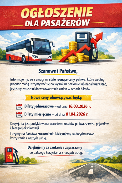 Prosimy pasażerów o zapoznanie się z nowymi godzinami odjazdów. Zapraszamy do korzystania z naszych usług. Mamy nadzieję, że nowa trasa pomoże i znacznie ułatwi mieszkańcom dotarcie do różnych instytucji.