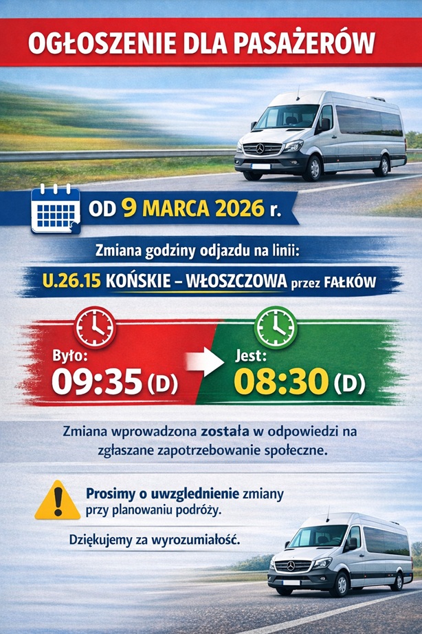 Prosimy pasażerów o zapoznanie się z nowymi godzinami odjazdów. Zapraszamy do korzystania z naszych usług. Mamy nadzieję, że nowa trasa pomoże i znacznie ułatwi mieszkańcom dotarcie do różnych instytucji.