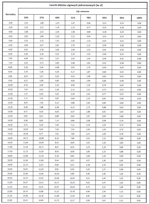 Cennik biletów ulgowych